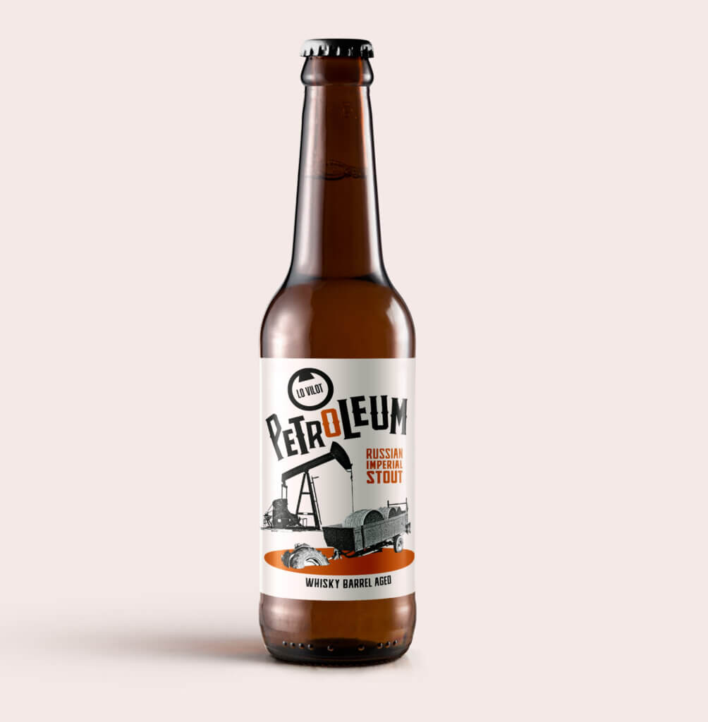 Imperial Stout Whisky Beer – Petroleum: Intense black strong, alcoholic and malty beer, with notes of chocolate, liquorice, wood, whisky and a hint of coffee. Dense and persistent foam of a dark cinnamon colour. Aged in a whisky cask. Ingredients produced at the Lo Vilot Farm Brewery.